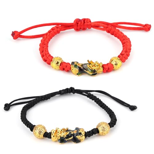 Mikovivi 2pcs Bracelet de Richesse, Bracelet Richesse Porte-Bonheur Rouge Noir avec des Bêtes Mythiques Chinoises Attire la Prospérité de la Fortune Bijoux Porte-Bonheur pour Hommes Femmes