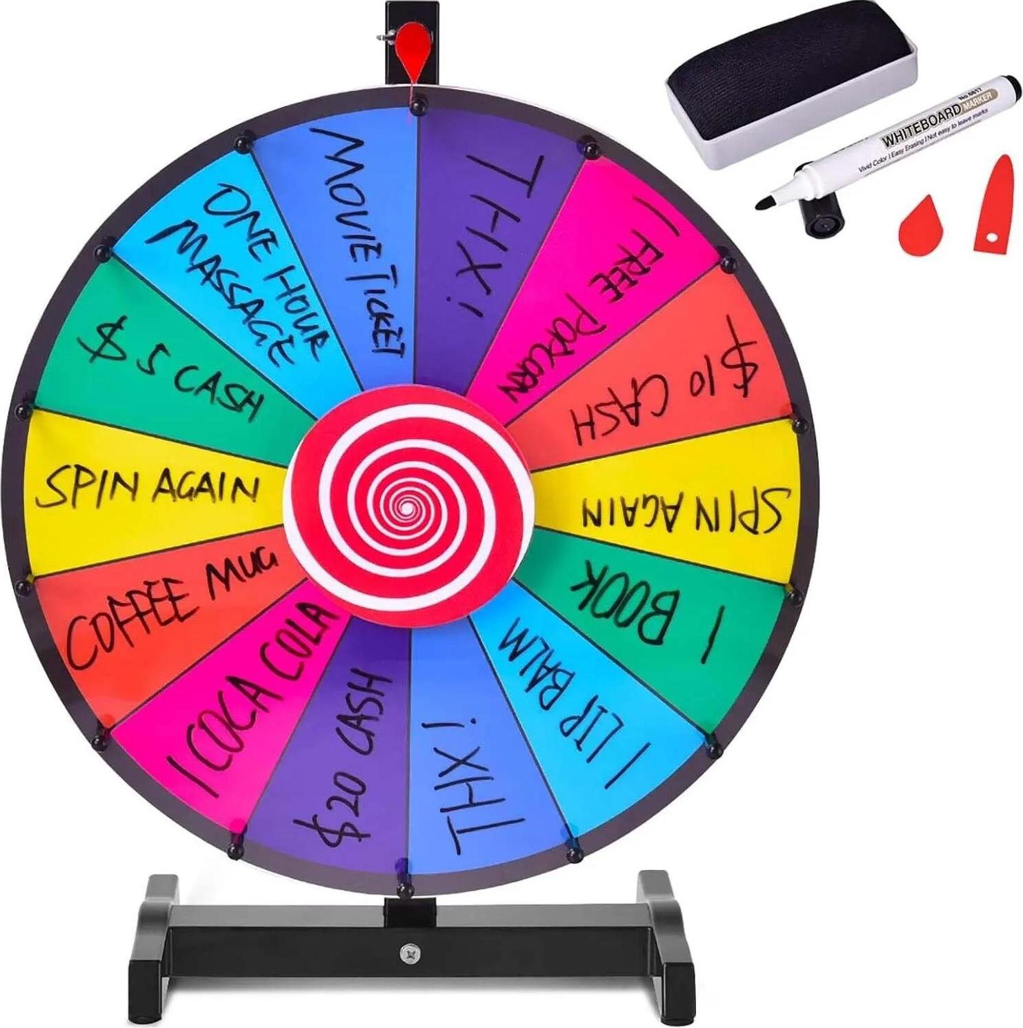 roue de la fortune de 91 cm avec 18 compartiments, roue de la roulette avec stylo effaçable à sec & 2 marqueurs, à poser sur une table ou sur le sol pour jouer à des jeux de hasard lors de soirées, dans des bars, etc.