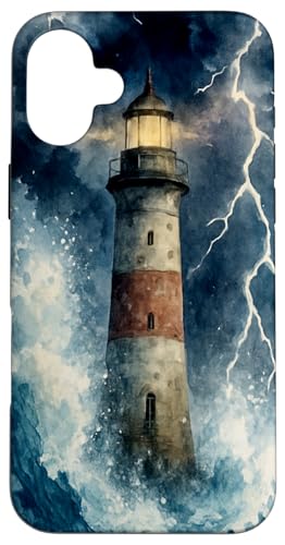 Phare dans la tempête avec Flash Paysage Marin Dramatique Coque pour iPhone 16 Plus