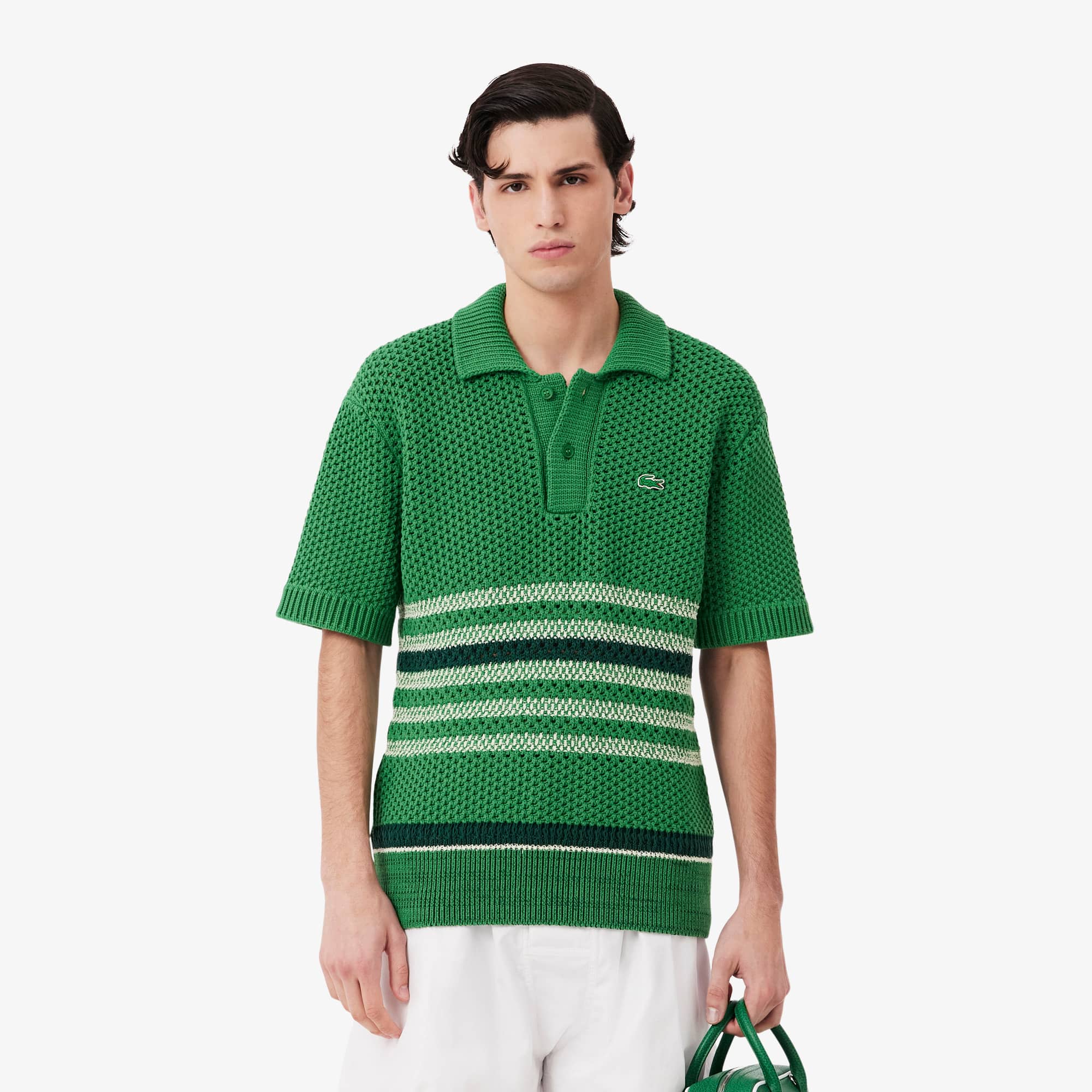 Lacoste Pull col polo Piqué ajouré rayé Défilé Taille M Vert/blanc