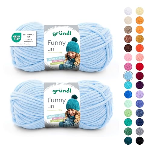 Gründl Laine Funny uni - laine chenille douce pour le crochet – moelleuse et respectueuse de la peau - 100% polyester – 2 pelotes 100 g / 120 m – taille d’aiguille 5-6 -bleu pastel