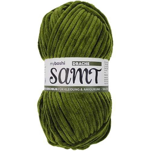 myboshi Laine velours pour crochet et tricot - Pelote de laine chenille douce en pelote XXL - Parfaite pour l'amigurumi et les coussins - 100% polyester moelleux - 100 g - 100 m - Vert dragon - 1