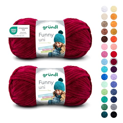 Gründl Wolle Funny uni - laine chenille douce pour le crochet - fil chenille 100% polyester, 2 pelotes (100 g/ 120 m, taille des aiguilles : 5-6) - Bordeaux