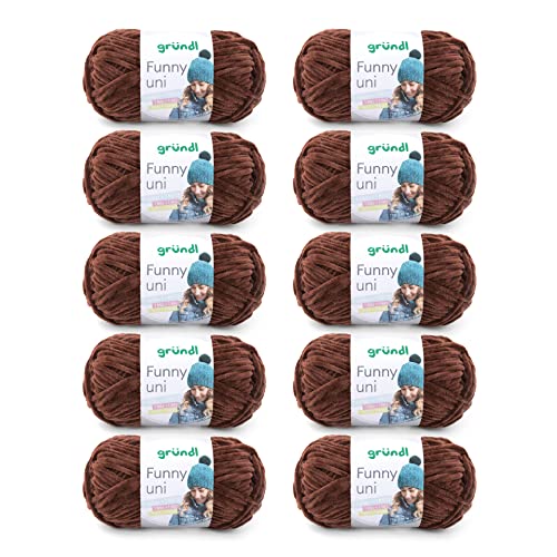 Gründl Laine Funny uni - Laine Chenille Douce pour Le Crochet – Moelleuse et respectueuse de la Peau - 100% Polyester – 10 pelotes 100 g / 120 m – Taille d’Aiguille 5-6 - Brun