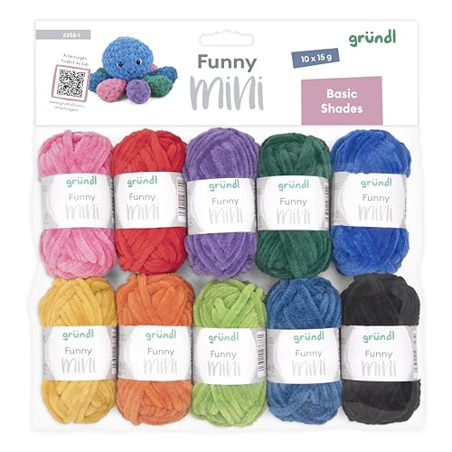 Gründl Laine Funny Mini Shades - laine chenille douce pour le crochet de petites figurines - 100% polyester - 10 mini pelotes 15 g/18 m - aiguilles n° 5-6 - multicolore