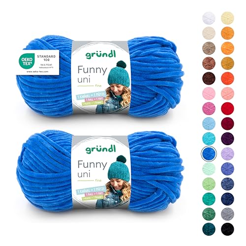 Gründl Laine Funny uni - laine chenille douce pour le crochet – moelleuse et respectueuse de la peau - 100% polyester – 2 pelotes 100 g / 120 m – taille d’aiguille 5-6 -bleu royal