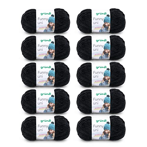 Gründl Laine Funny uni - laine chenille douce pour le crochet – moelleuse et respectueuse de la peau - 100% polyester – 10 pelotes 100 g / 120 m – taille d’aiguille 5-6 -Noir