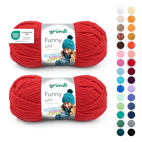 Gründl Laine Funny uni - laine chenille douce pour le crochet – moelleuse et respectueuse de la peau - 100% polyester – 2 pelotes 100 g / 120 m – taille d’aiguille 5-6 -cerise