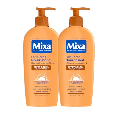 MIXA - Lait Corps Nourrissant Effet Soleil - Autobronzant Progressif & Nutrition - Beurre de Karité & Huile d’Abricot - Peaux Mates - 250ml