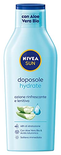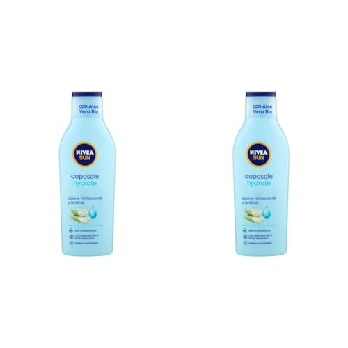 NIVEA SUN Lait Après-soleil Hydrate 200 ml, Crème après-soleil à l'aloe vera bio et acide hyaluronique, Crème hydratante pour le corps à action rafraîchissante et apaisante (Lot de 2)
