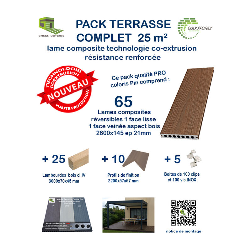 Green Outside – Kit complet 25 m² lame de terrasse composite Coexprotect® – Couleur pin – L.260 x l.14.5 cm – Résistant milieu humide – Installation