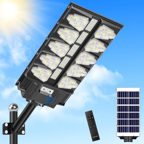 Adewalk 2000W lampadaire solaire avec télécommande, Lampe solaire extérieure étanche ip66 avec capteur de mouvement, 6500k lumière solaire super lumineux spot Solaire LED jardin extérieur garage rue