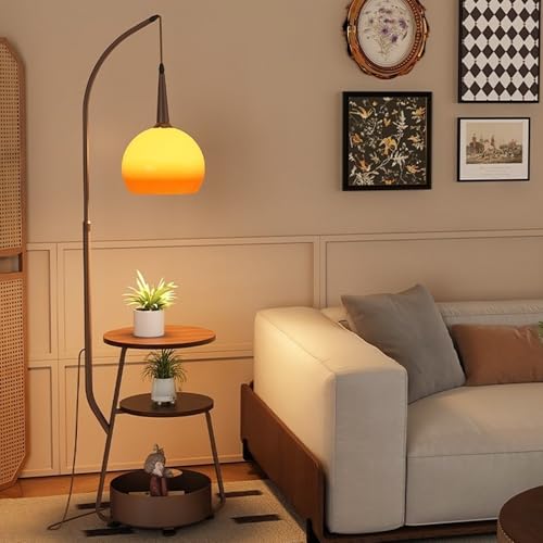 KlkrzJwy Lampadaire Arqué Avec Table En Bois, Lampe Sur Pied En Verre Orange À Globe Réglable En Hauteur, Lampe De Sol À Intensité Variable E27 Pour Salon Et Chambre.