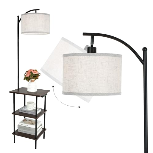 LuminexDesigns Lampadaire Vintage avec Étagères, Lampe sur Pied en Bois avec Table d’Appoint et Station de Charge, Noyer Rétro, 3 Niveaux de Rangement, Tête Orientable, pour Salon, Chambre, Coin