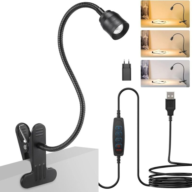 Usb Lampe de Chevet, 7W Lampe de Bureau, Lampe à Pince, 3 Couleur et 10 Luminosité Réglable, Lampe Clip de Lit/Bureau/Chevet/Lecture pour Livre