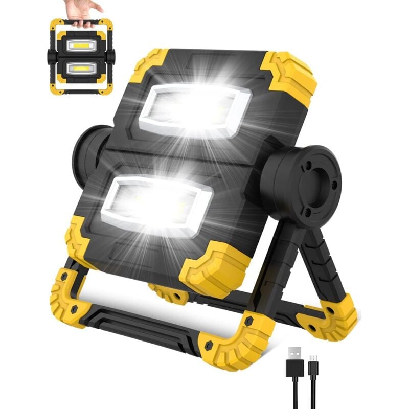 Lampe Pour Chantier LED Rechargeable Projecteur - 2 COB 2000 lm Lampe de Travail rotative à 360°, Portable Dimmable Spot Lumière Pour Atelier Garage