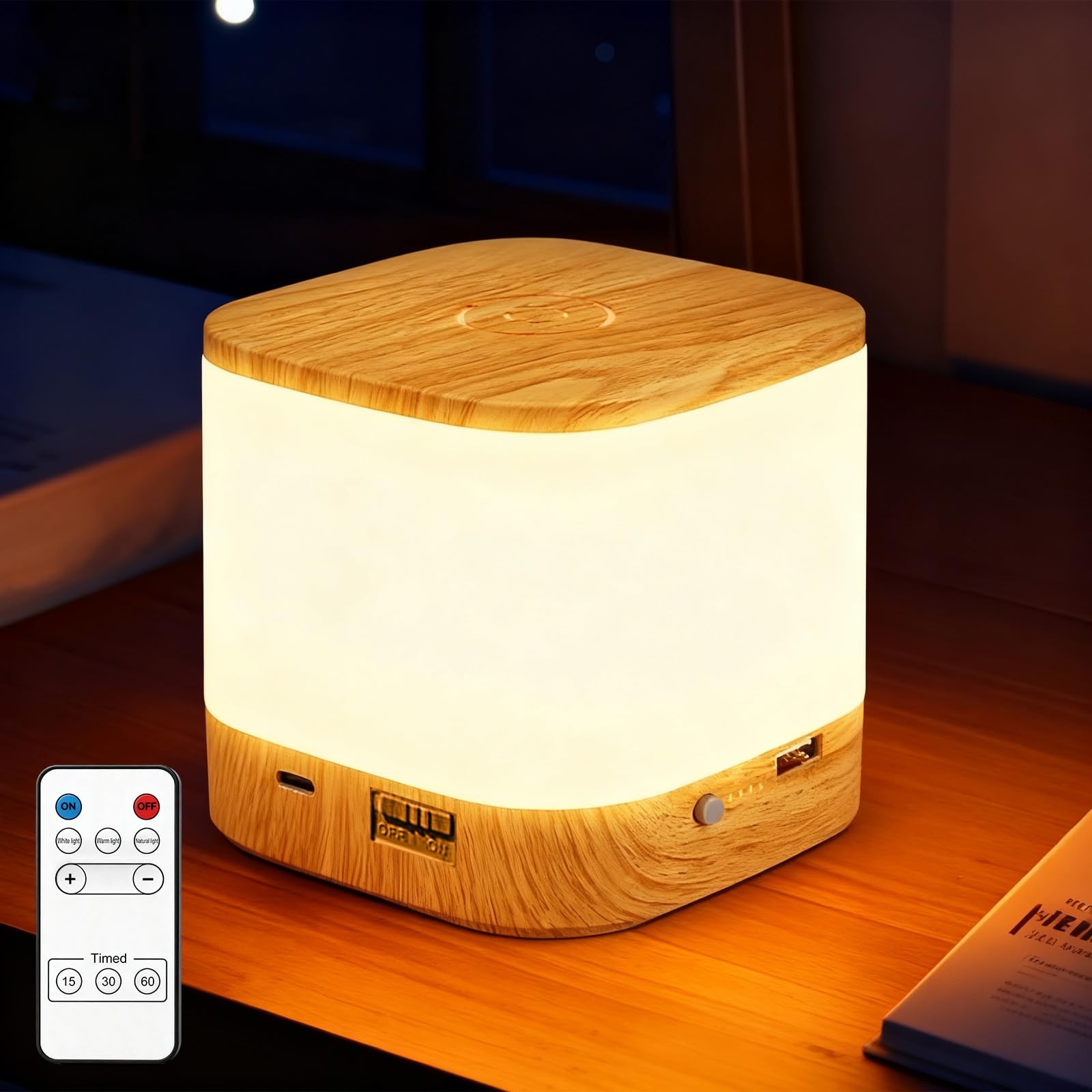 GAOUTO Lampe de chevet tactile à intensité variable - Batterie - Grain de bois - Lampe de table sans fil avec télécommande - Rechargeable par USB - Lampe de chevet LED avec 3 modes et minuterie