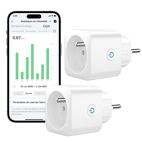 Meross Prise Connectée (FR), 16A Prise WiFi Compatible avec Alexa et Google Home, Lot de 2 Prise Mesure Consommation Intelligente avec Commande Vocale, Contrôle à Distance et Configuration Bluetooth