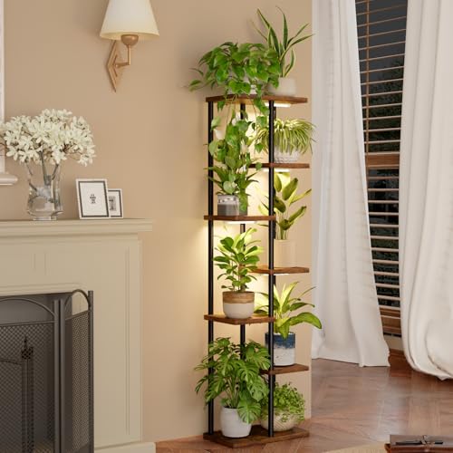 Bamworld Support Plantes Interieur avec Lampe, Étagère Plante d'Angle 7 Niveaux Bois et Métal, Support Plante avec Éclairage pour Salon Balcon Chambre, Décoratif
