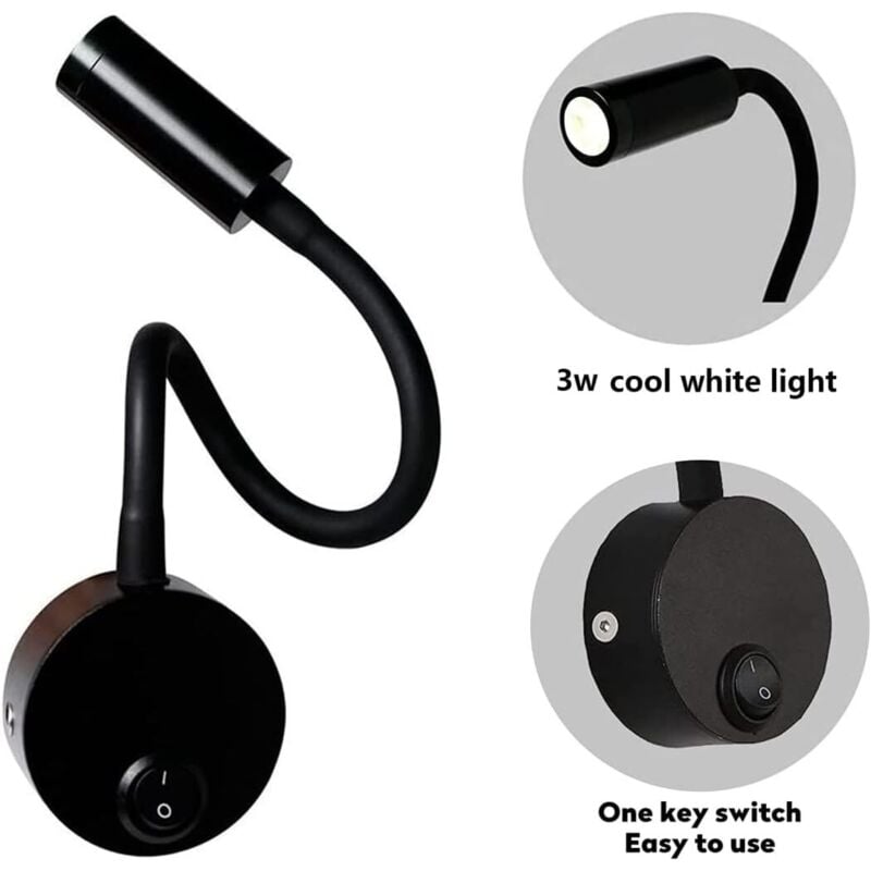 2 Pièces Noire Lampe de lecture Murale 3W, Flexible Cou Réglable Applique Lampe de Bureau en Aluminium, Lampe de Chevet avec Interrupteur led Soins