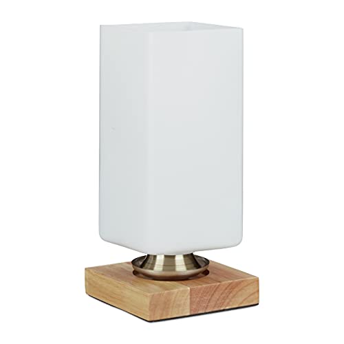 Relaxdays Lampe de table rectangle verre opale lampe de chevet lampe d'ambiance HxlxP: 25,5 x 12 x 12 cm lampe de lecture socle en bois, blanc nature