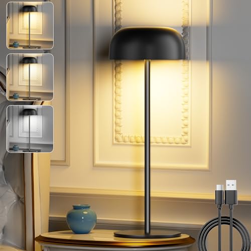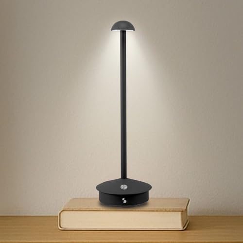 LED Lampe de Table LED Sans fil Rechargeable Métal,3 Couleur Lampe de Bureau Chevet Dimmable Contrôle Tactile, IP54 pour Patio,Terrasse,Café, Chambre (noir, 1)