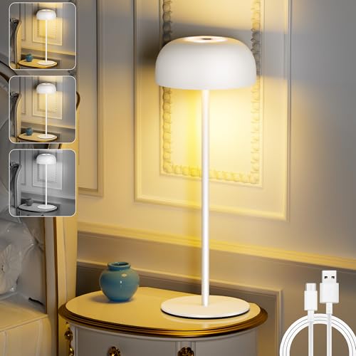 LED Lampe de Table LED Sans fil Rechargeable Métal,3 Couleur Lampe de Bureau Chevet Dimmable Contrôle Tactile, IP54 pour Patio,Terrasse,Café, Chambre (Blanc, 1)