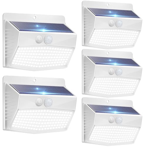 Peasur Lumiere Solaire Exterieur Lot de 5, 138LED Lampe Solaire avec Detecteur de Mouvement, Étanche 3 Modes Eclairage Exterieur Solaire Spot Led Sans Fil pour Jardin Terrasse Garage[Bordure Blanche]