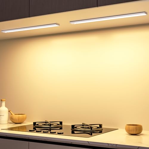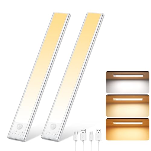 Lampe LED Rechargeable Cuisine Reglette, 2200mAh USB Sans Fil Lampe Detecteur de Mouvement Interieur 3 Couleurs Dimmable Placard Eclairage Magnétique Lampe d'Armoire pour Escalier Dressing, 2 Pack