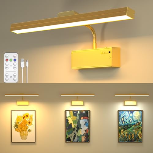 Applique Murale pour Tableaux, LED Eclairage Tableau Sans Fil à Télécommande, Batterie Rechargeable 3000mAh, 3 Temps de Couleur, Lampe Tableau pour Portraits, Photo et Cible de Fléchettes (Doré)