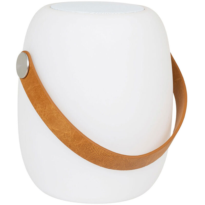 Cardiff lampe extérieure LED avec sangle en cuir, haut-parleur Bluetooth, rechargeable blanche.