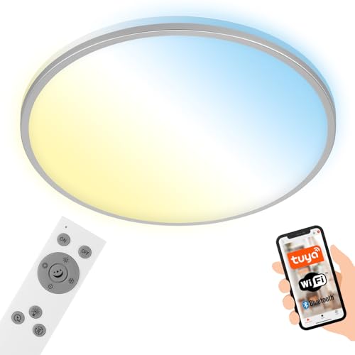 BRILONER - Lampe de plafond LED plate Smart Home, compatible avec Alexa, télécommande, lampe LED, plafonnier LED, lampe de salon, panneau LED, lampe de chambre, 33,3x6,2 cm, chrome mat