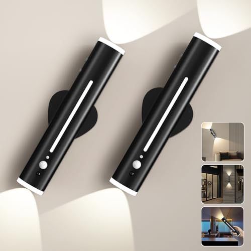 Lot de 2 Applique Murale a Pile Interieur Rechargeable avec Détecteur de Mouvement, 2,8w LED Lampe Murale Sans Fil, 2000 Mah Portable Magnétique Lumière Escalier avec Interrupteur, Noir, 6000K