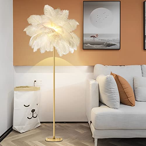 Lampe Plume d'Autruche, Lampadaires pour Salon avec Ampoule LED 3 Températures de Couleur, Lampadaire avec Interrupteur à Pied pour Chambre/Canapé Décor Corne, Corps de Lampe Doré, 1.6m (White)