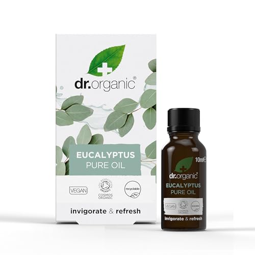 Huile Essentielle d’Eucalyptus Dr Organic, 100% Pure et Naturelle, Revigorante, pour le Soulagement de la Congestion, Aromathérapie,Massage, Végan, Sans Cruauté, Sans Parabène et SLS, 10ml