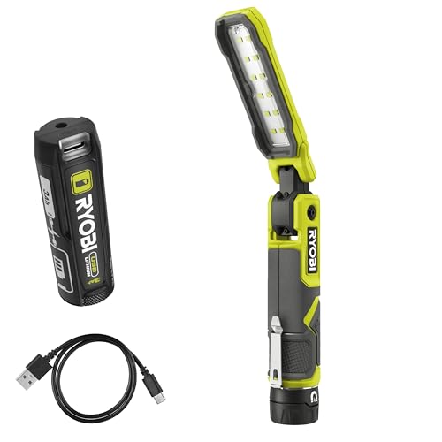 RYOBI - Lampe de travail 4V USB Lithium - 3 intensités : 500/250 / 100 Lumens - Base magnétique - Livrée avec câble USB-C + batterie 3Ah (Powerbank - recharge les téléphones)