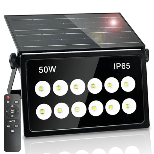 BOSITE 50W Projecteur Solaire Exterieur, 3000mAh Lumière Solaire Extérieure Avec Télécommande, 6500K Lampe Solaire Exterieur, IP65 Étanches Spot Solaire Exterieur pour Porche Patio Jardin Garage Allée