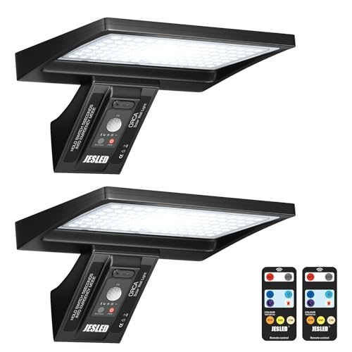 JESLED Lampe Solaire Exterieur, 90 LED Lumiere Solaire Exterieur avec Détecteur de Mouvement, 2600mAh 4 Modes Projecteur Solaire, 3000K-6000K Lampe Solaire avec Télécommande pour Jardin, 2 Paquet