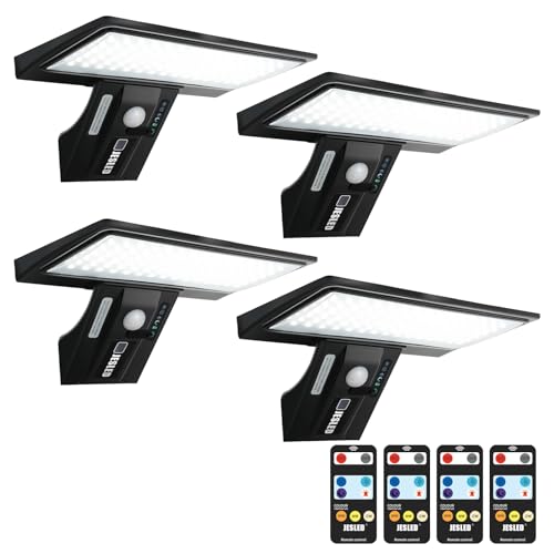 JESLED Lampe Solaire Exterieur, 90 LED Lumiere Solaire Exterieur avec Détecteur de Mouvement, 2600mAh 4 Modes Projecteur Solaire, 3000K-6000K Lampe Solaire avec Télécommande pour Jardin, 4 Paquet