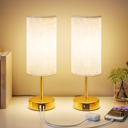 UPXNBOR Lot de 2 lampes de chevet avec fonction de charge via ports USB-A et USB-C, lampe de lecture, lampe de bureau, lampe de chevet tactile à intensité variable, 3 niveaux de lumière chaude, câble