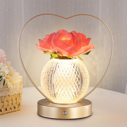 Lampe tactile en forme de rose - Lampe de table rechargeable sans fil - 3 couleurs - Petite veilleuse - Cadeau pour maman pour la Saint-Valentin, la fête des mères, Noël
