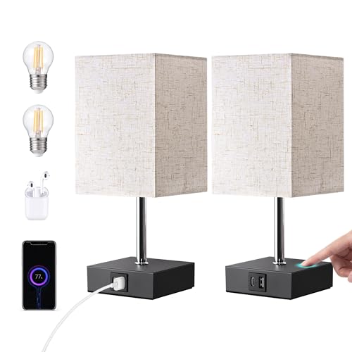 EDISHINE Lampe de Chevet Tactile Lot de 2, avec USB-A & USB-C Port de Charge, E27 Ampoule LED Incluse, 3 Intensités Réglables, Lampe de Table LED pour Chambre, Salon, Hôtel, Abat-jour de Lin