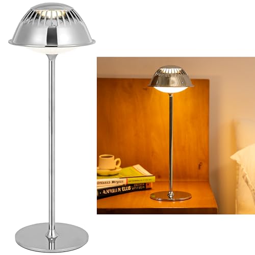 LuminexDesigns Lampe de Table LED Sans Fil – Lampe de Chevet Tactile Dimmable Rechargeable au Design Moderne, Élégante en Métal Argenté, Finition Chromée pour Chambre, Salon, Bureau Bar en Extérieur