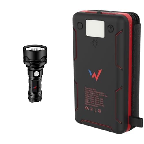 W WONDER FULL ENERGY - Pack 1 Lampe torche ultra puissante 1500 lumens, IP44 + 1 Batterie externe solaire 10 000mAh, 2 Port USB-A & 1 Port USB-C