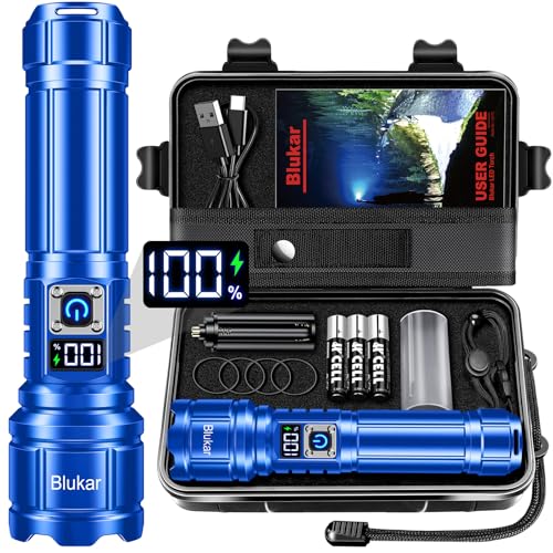 Blukar Lampe Torche LED Ultra Puissante Super Lumineux, Lampe de Poche Rechargeable 5000mAh, Zoomable 5 Modes, IP67 Étanche, Longue Durée LED Torche pour Camping Randonnée Pêche Urgence,Bleu