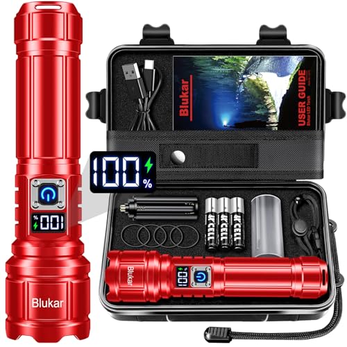 Blukar Lampe Torche LED Ultra Puissante Super Lumineux, Lampe de Poche Rechargeable 5000mAh, Zoomable 5 Modes, IP67 Étanche, Longue Durée LED Torche pour Camping Randonnée Pêche Urgence,Rouge
