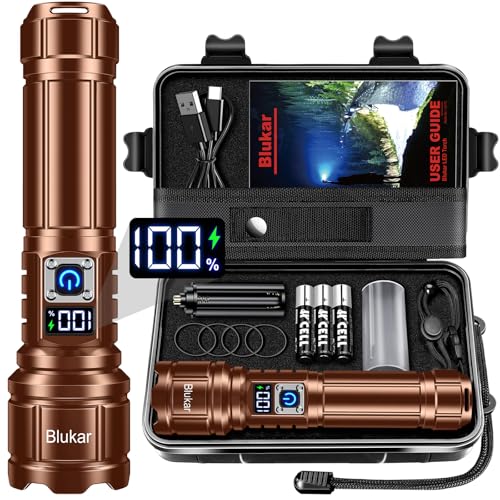 Blukar Lampe Torche LED Ultra Puissante Super Lumineux, Lampe de Poche Rechargeable 5000mAh, Zoomable 5 Modes, IP67 Étanche, Longue Durée LED Torche pour Camping Randonnée Pêche Urgence,Brun