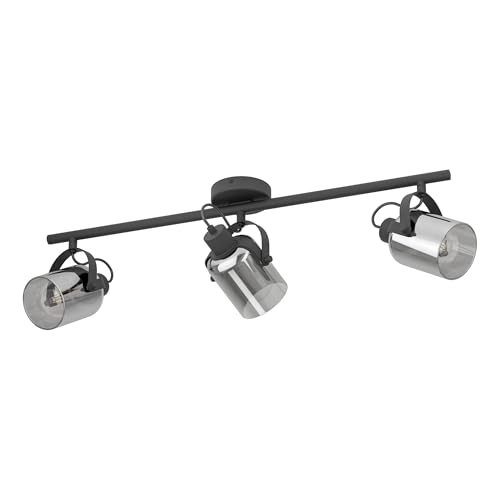 Eglo plafonnier Berregas, barre 3 spots, spots plafond avec abat-jours en verre, lampe métal noir et verre fumé, douille E27