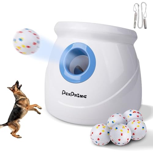Pet Prime Lanceur de balles automatique pour chien - Jouet interactif pour chiens de grande taille avec une portée de 3 à 20 mètres - Avec 6 balles en TPU de 6,9 cm et un sifflet d'entraînement
