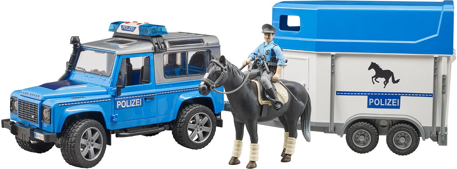 Bruder Land Rover Def. Police vehicle horse trailer,horse+policeman male 2588